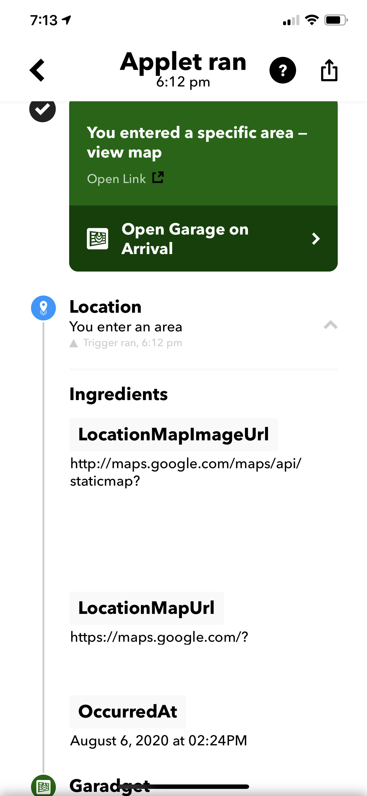 So IFTTT is not perfect and I have had this happen before. It’s never taken this long, but it has been several minutes after I got home. I believe it’s due to the fact that IFTTT didn’t pickup my location quickly from my phone and once it finally did (many minutes later) it immediately triggered the open action.